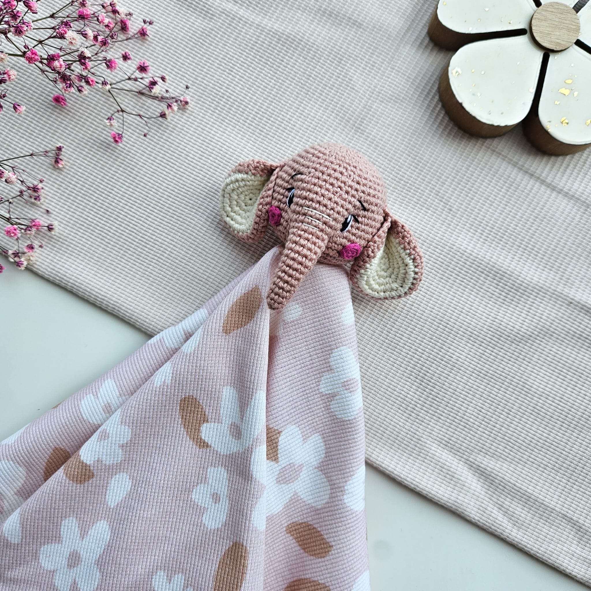 Bawełniana pieluszka z główką słonika wykonaną na szydełku. Oryginalny pomysł na pierwszą zabawkę dla maluszka.